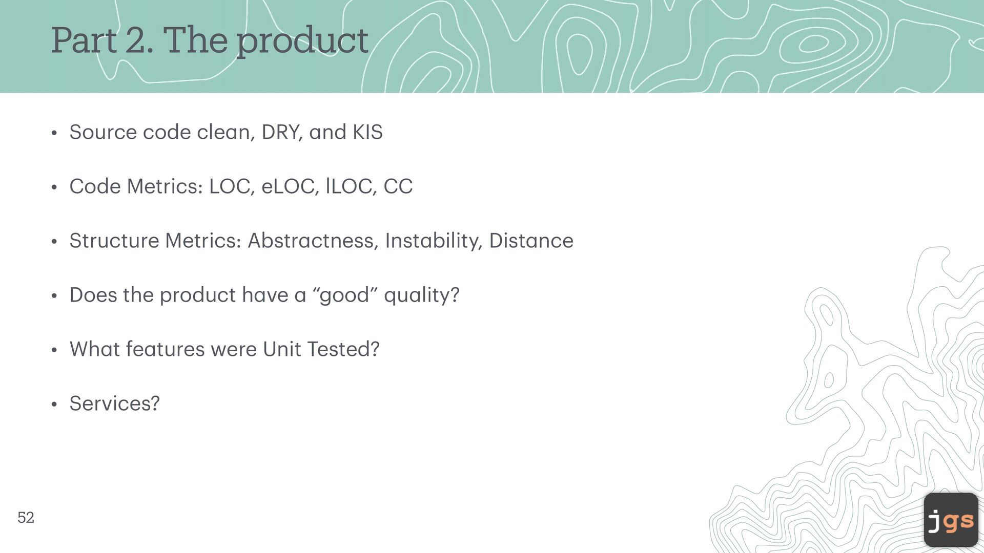DRY, a nd KIS • Code Metrics: LOC, eLOC, lLOC, CC • Structure Metrics: Abstr a ctness, Inst a bility, Dist a nce • Does the product h a ve a “good” qu a lity? • Wh a t fe a tures were Unit Tested? • Services? 52