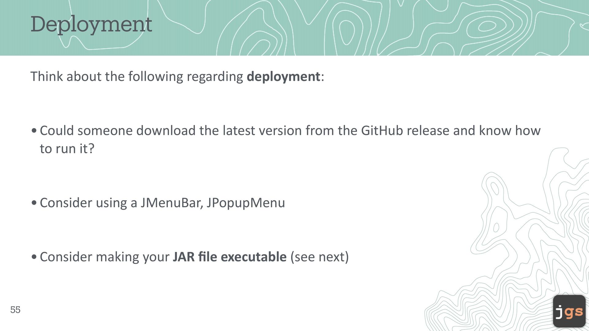 the latest version from the GitHub release and know how to run it? •Consider using a JMenuBar, JPopupMenu •Consider making your JAR fi le executable (see next) 55