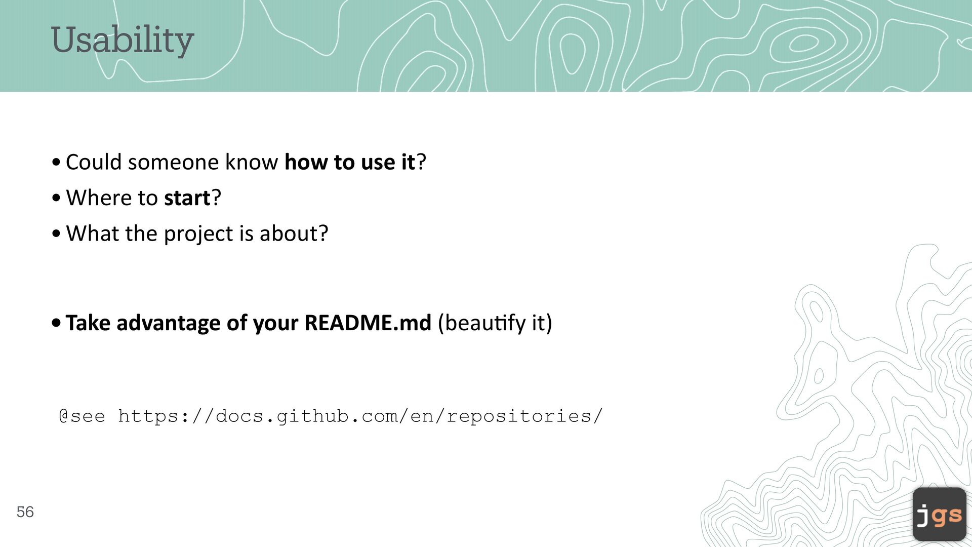 start? •What the project is about? •Take advantage of your README.md (beau ti fy it) @see https://docs.github.com/en/repositories/ 56