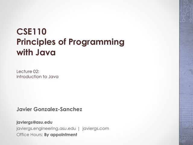 01 • Lab 01 will be to install an IDE (Integrated Development Environment) for Java • IDE = Text Editor + Java Compiler + Java Virtual Machine + Fancy Tools
