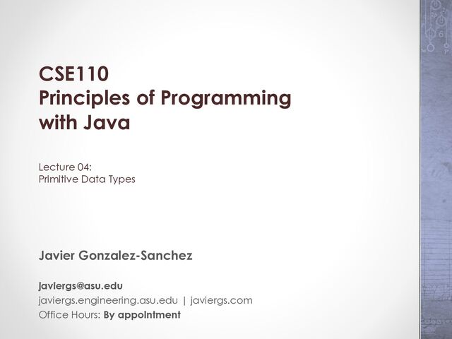 Types § There are exactly eight primitive data types in Java § Four of them represent integers: byte, short, int, long § Two of them represent floating point numbers: float, double § One of them represents characters: char § And one of them represents boolean values: boolean