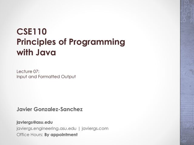 Method • %d à to print an integer • %5d à to print an integer with width 5 • %7.2f à to print a floating point number with 2 digits after the decimal point and with width 7 (including the decimal point) • %s à to print a string
