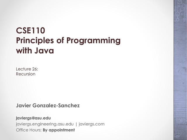 C public static void main(String[]args) { printNumbers(10); } // a recursive method will always have a condition public static void printNumbers(int num) { if (num == 0) System.out.println(num); else { System.out.println(num); printNumbers(num-1); // recursive System.out.println(num); } }