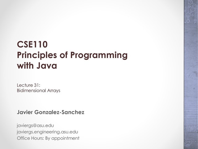 Array • A two-dimensional array is an array of arrays • A two-dimensional array is declared by specifying the size of each dimension separately int[][] scores = new int[12][50]; • A array element is referenced using two index values value = scores[3][6]