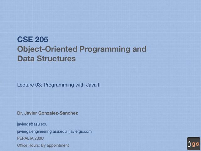 Programming with Java II Dr. Javier Gonzalez-Sanchez [email protected] javiergs.engineering.asu.edu | javiergs.com PERALTA 230U Office Hours: By appointment