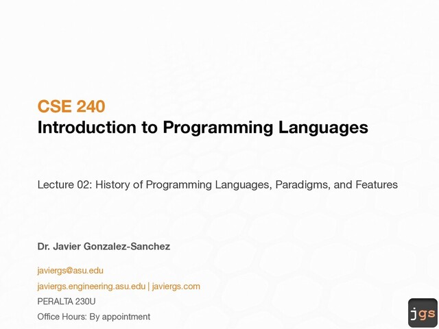of Programming Languages, Paradigms, and Features Dr. Javier Gonzalez-Sanchez [email protected] javiergs.engineering.asu.edu | javiergs.com PERALTA 230U Office Hours: By appointment