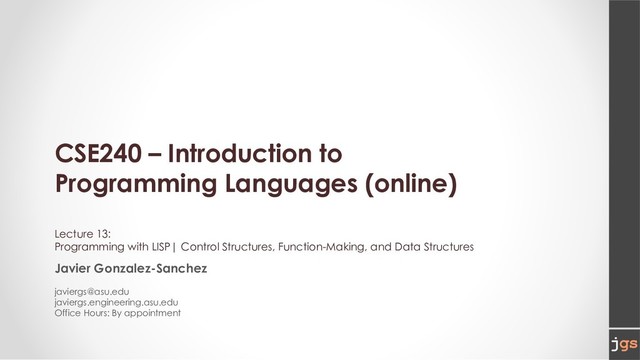 with LISP| Control Structures, Function-Making, and Data Structures Javier Gonzalez-Sanchez [email protected] javiergs.engineering.asu.edu Office Hours: By appointment