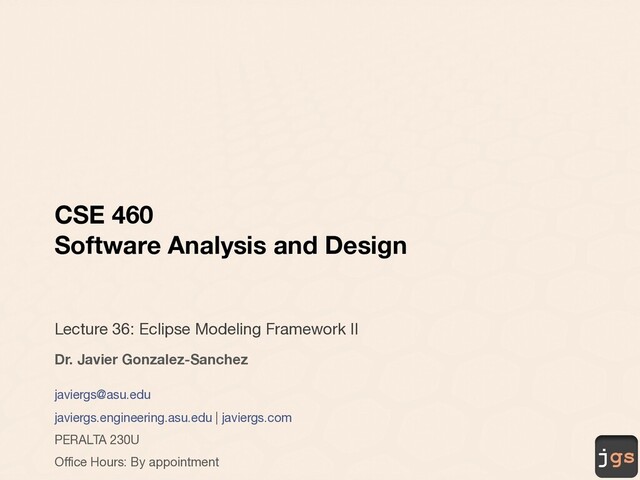 Modeling Framework II Dr. Javier Gonzalez-Sanchez [email protected] javiergs.engineering.asu.edu | javiergs.com PERALTA 230U Office Hours: By appointment