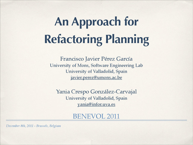 remove-method (method) end strategy remove-feature-envy move-method (method) body alt branch apply remove-feature-envy move-method-to-user-class (method) branch apply remove-feature-envy move-method-to-data-class (method) branch apply remove-feature-envy move-method-to-envied-class (method,env-class) end end strategy remove-feature-envy move-method-to-user-class (method) precondition method-fqn(method, pkg-name, class-name, method-name) user-query("Package name of new class for method", (pkg-name, class-name, method-name), tgt-pkg-name) user-query("Class name of new class for method", (pkg-name, class-name, method-name), tgt-class-name) class-fqn(tgt-class, tgt-pkg-name, tgt-class-name) body apply remove-feature-envy move-method-to-envied-class (method, tgt-class) end strategy remove-feature-envy move-method-to-data-class (method) precondition smell("data class", env-class) user-query("Class name of new class for method", (pkg-name, class-name, method-name), tgt-class-name) class-fqn(tgt-class, tgt-pkg-name, tgt-class-name) body apply remove-feature-envy move-method-to-envied-class (method, tgt-class) end strategy remove-feature-envy move-method-to-data-class (method) precondition smell("data class", env-class) get-envied-class (method, env-class) body apply remove-feature-envy move-method-to-envied-class (method, env-class) end strategy remove-feature-envy move-method-to-envied-class (method, env-class) precondition get-envied-class (method, env-class) get-movemethod-reference (method, env-class, reference) body apply move-method all-sts (method, env-class, reference) end Listing 6.9: Draft of some strategies that may be defined to remove a Feature Envy method. 138 CHAPTER 6. CASE STUDY strategy move-method all-sts (method, tgt-class, reference) body alt branch apply move-method trivial (method, tgt-class, reference) branch apply move-method basic (method, tgt-class, reference) end end strategy move-method trivial (method, tgt-class, reference) body