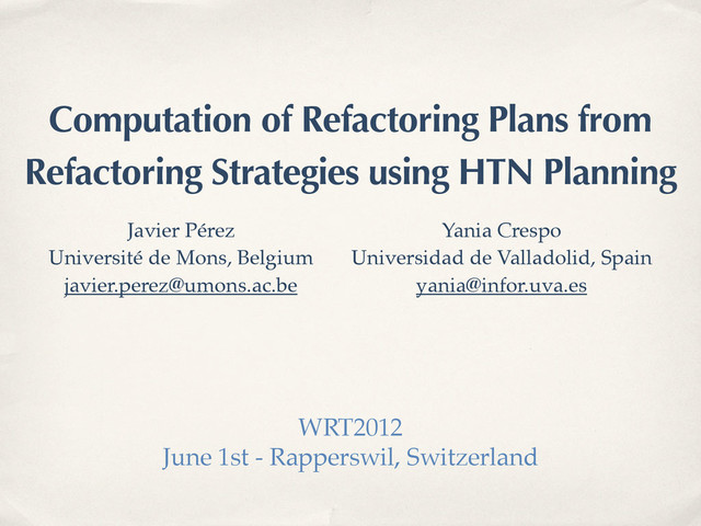Complex refactoring processes, such as applying big refactorings or removing design smells are difficult to perform in practice. The complexity of these processes is partly due to their heuristic nature and to the constraints imposed by preconditions on the applicability of the individual refactorings. We introduce refactoring strategies as heuristic-based, automation-suitable specifications of a complex refactoring process. They allow us to specify correction strategies and big refactorings more formally than it is done in current catalogues. Refactoring strategies can be instantiated, for each particular case, into refactoring plans. We define refactoring plans as sequences of refactorings that are immediately applicable over the current system source code. We have developed an approach for instantiating refactoring strategies into refactoring plans that uses Hierarchical Task Network (HTN) planning. This paper describes this approach and presents a case study, in order to evaluate and characterise it. Presented at WRT 2012 (http://www.ifs.hsr.ch/WRT2012.7401.0.html).