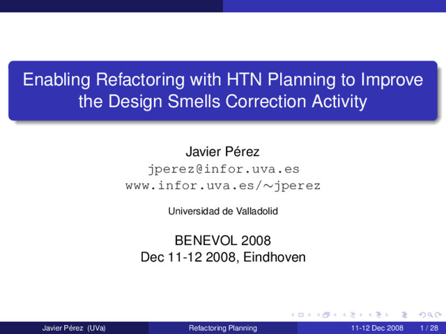 Refactorings are a key technique to software evolution. They can be used to improve the structure and quality of a software system. This paper introduces a proposal for generating refactoring plans with hierarchical task network planning, to improve the automation of the bad smells correction activity. Presented at Benevol 2008 (http://www-set.win.tue.nl/benevol2008).