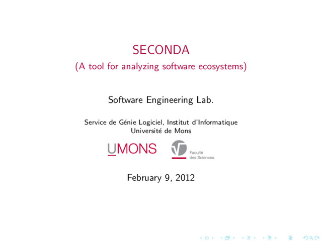 Future work SECONDA Software analysis Ecosystem grouped analysis Single project analysis Developer’s Analysis Community analysis Single developer analysis Tools: Data extraction Identity merging Metrics Visualisation Statistics Reporting Software Engineering Lab. (UMONS) SECONDA February 9, 2012 4 / 15