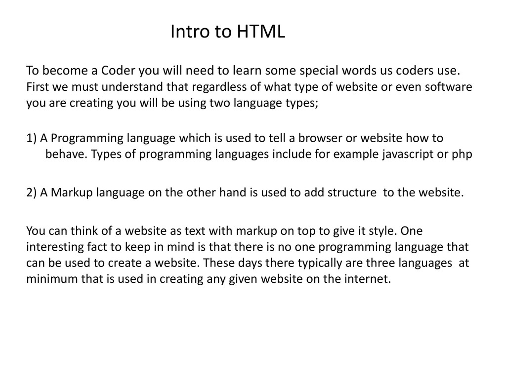 to learn some special words us coders use. First we must understand that regardless of what type of website or even software you are creating you will be using two language types; 1) A Programming language which is used to tell a browser or website how to behave. Types of programming languages include for example javascript or php 2) A Markup language on the other hand is used to add structure to the website. You can think of a website as text with markup on top to give it style. One interesting fact to keep in mind is that there is no one programming language that can be used to create a website. These days there typically are three languages at minimum that is used in creating any given website on the internet.