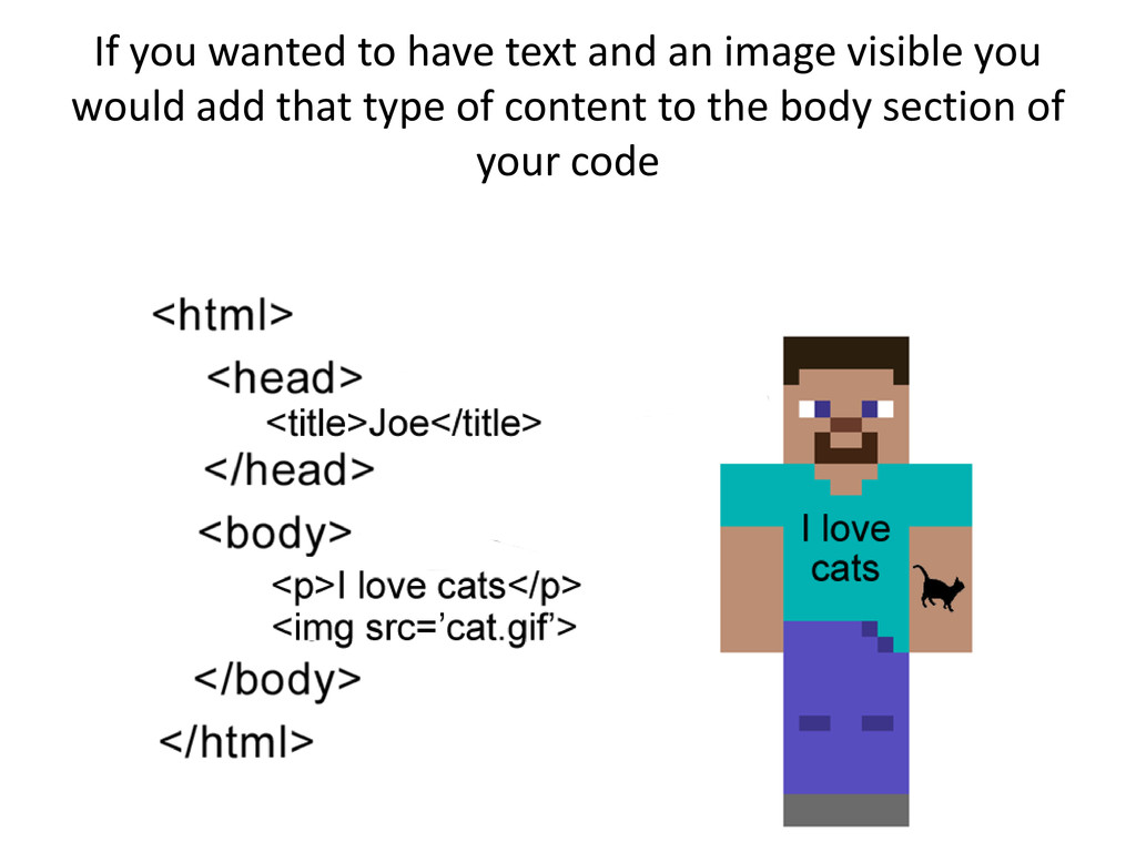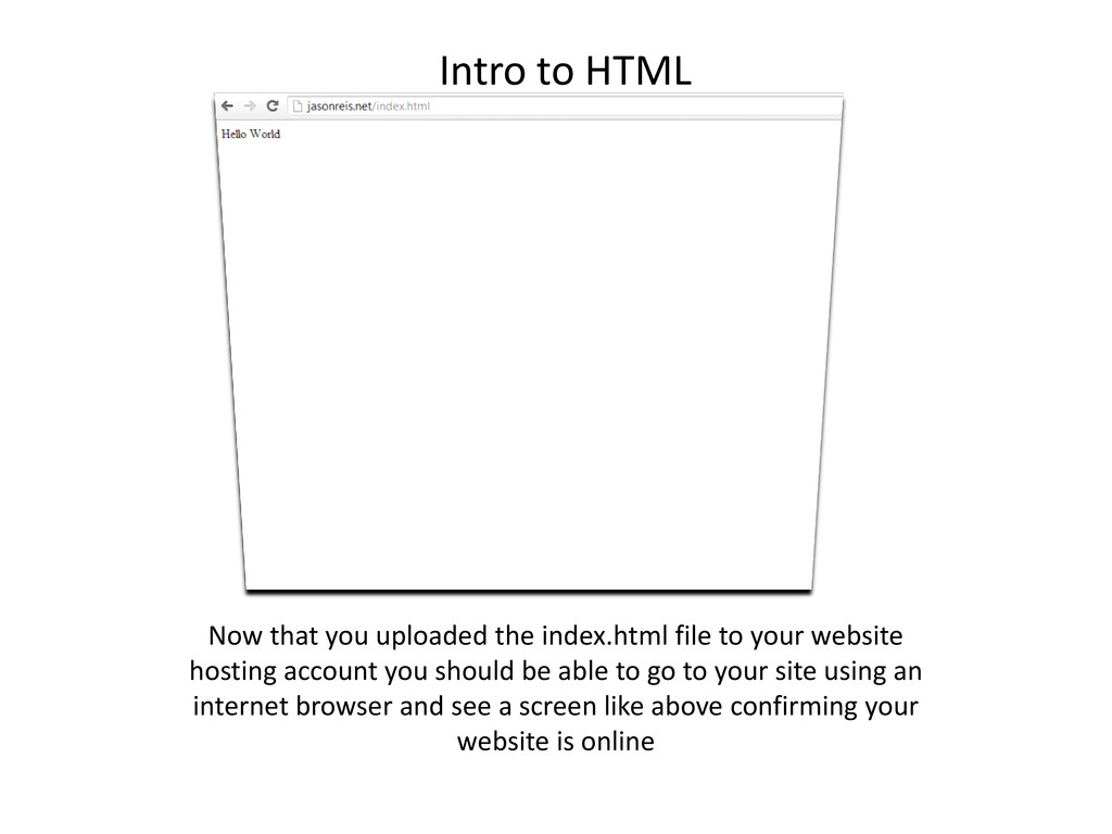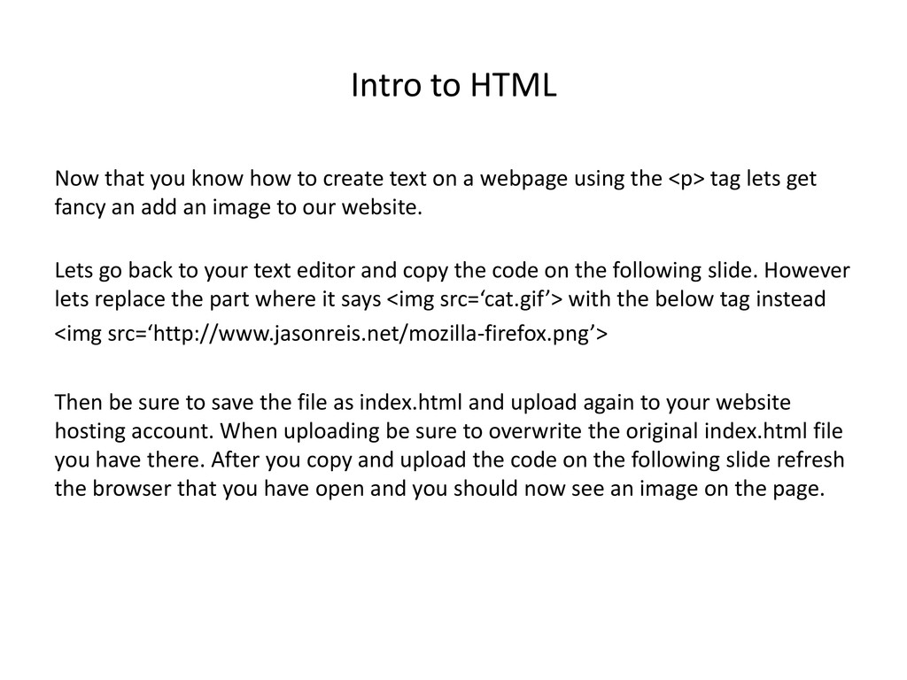 text on a webpage using the <p> tag lets get fancy an add an image to our website. Lets go back to your text editor and copy the code on the following slide. However lets replace the part where it says <img src=‘cat.gif’> with the below tag instead <img src=‘http://www.jasonreis.net/mozilla-firefox.png’> Then be sure to save the file as index.html and upload again to your website hosting account. When uploading be sure to overwrite the original index.html file you have there. After you copy and upload the code on the following slide refresh the browser that you have open and you should now see an image on the page.