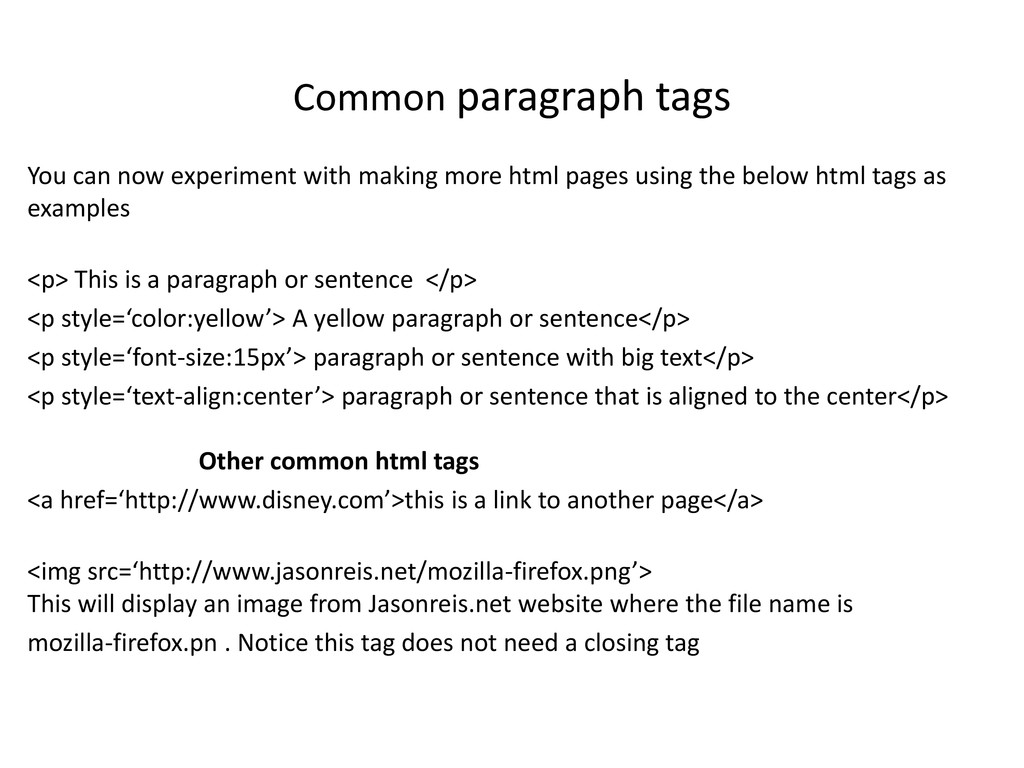 html pages using the below html tags as examples <p> This is a paragraph or sentence </p> <p style=‘color:yellow’> A yellow paragraph or sentence</p> <p style=‘font-size:15px’> paragraph or sentence with big text</p> <p style=‘text-align:center’> paragraph or sentence that is aligned to the center</p> Other common html tags <a href=‘http://www.disney.com’>this is a link to another page</a> <img src=‘http://www.jasonreis.net/mozilla-firefox.png’> This will display an image from Jasonreis.net website where the file name is mozilla-firefox.pn . Notice this tag does not need a closing tag