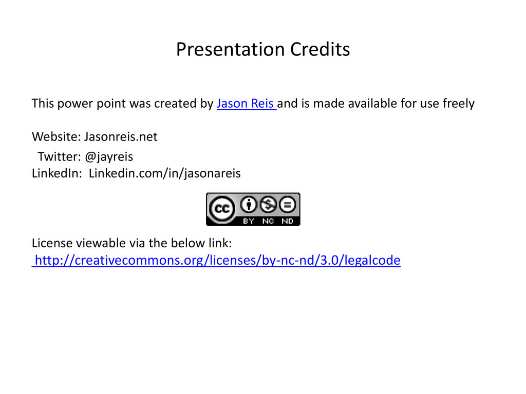 and is made available for use freely Website: Jasonreis.net Twitter: @jayreis LinkedIn: Linkedin.com/in/jasonareis License viewable via the below link: http://creativecommons.org/licenses/by-nc-nd/3.0/legalcode