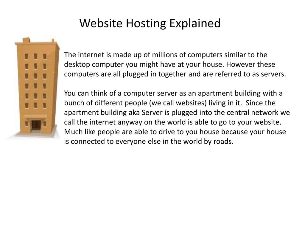 of computers similar to the desktop computer you might have at your house. However these computers are all plugged in together and are referred to as servers. You can think of a computer server as an apartment building with a bunch of different people (we call websites) living in it. Since the apartment building aka Server is plugged into the central network we call the internet anyway on the world is able to go to your website. Much like people are able to drive to you house because your house is connected to everyone else in the world by roads.