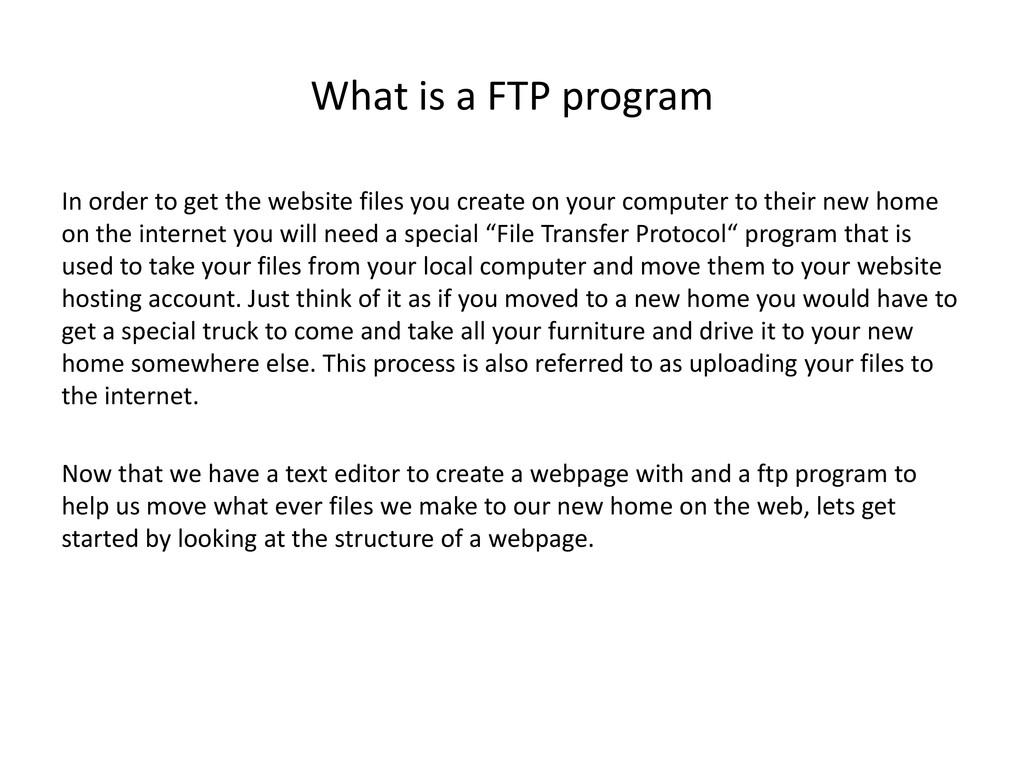 website files you create on your computer to their new home on the internet you will need a special “File Transfer Protocol“ program that is used to take your files from your local computer and move them to your website hosting account. Just think of it as if you moved to a new home you would have to get a special truck to come and take all your furniture and drive it to your new home somewhere else. This process is also referred to as uploading your files to the internet. Now that we have a text editor to create a webpage with and a ftp program to help us move what ever files we make to our new home on the web, lets get started by looking at the structure of a webpage.