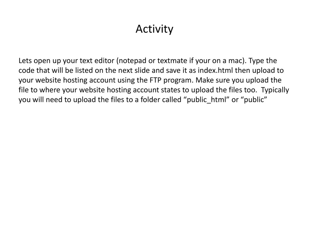if your on a mac). Type the code that will be listed on the next slide and save it as index.html then upload to your website hosting account using the FTP program. Make sure you upload the file to where your website hosting account states to upload the files too. Typically you will need to upload the files to a folder called “public_html” or “public”
