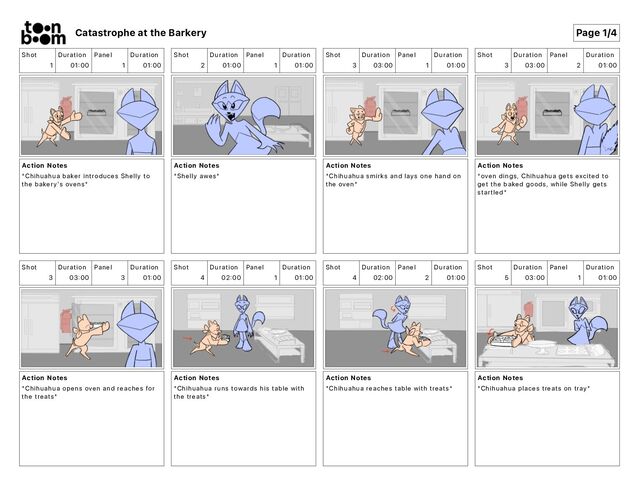 Action Notes *Chihuahua baker introduces Shelly to the bakery's ovens* Shot 2 Duration 01 00 Panel 1 Duration 01 00 Action Notes *Shelly awes* Shot 3 Duration 03 00 Panel 1 Duration 01 00 Action Notes *Chihuahua smirks and lays one hand on the oven* Shot 3 Duration 03 00 Panel 2 Duration 01 00 Action Notes *oven dings, Chihuahua gets excited to get the baked goods, while Shelly gets startled* Shot 3 Duration 03 00 Panel 3 Duration 01 00 Action Notes *Chihuahua opens oven and reaches for the treats* Shot 4 Duration 02 00 Panel 1 Duration 01 00 Action Notes *Chihuahua runs towards his table with the treats* Shot 4 Duration 02 00 Panel 2 Duration 01 00 Action Notes *Chihuahua reaches table with treats* Shot 5 Duration 03 00 Panel 1 Duration 01 00 Action Notes *Chihuahua places treats on tray* Catastrophe at the Barkery Page 1/4