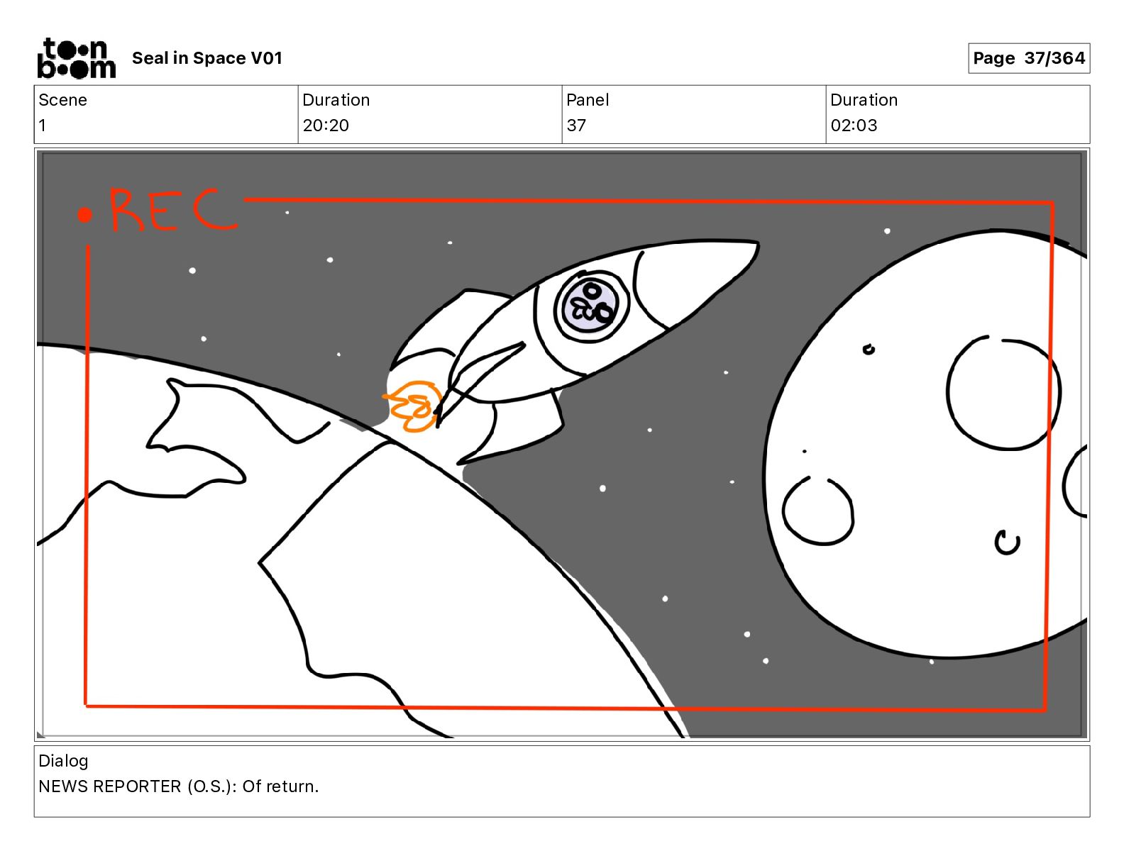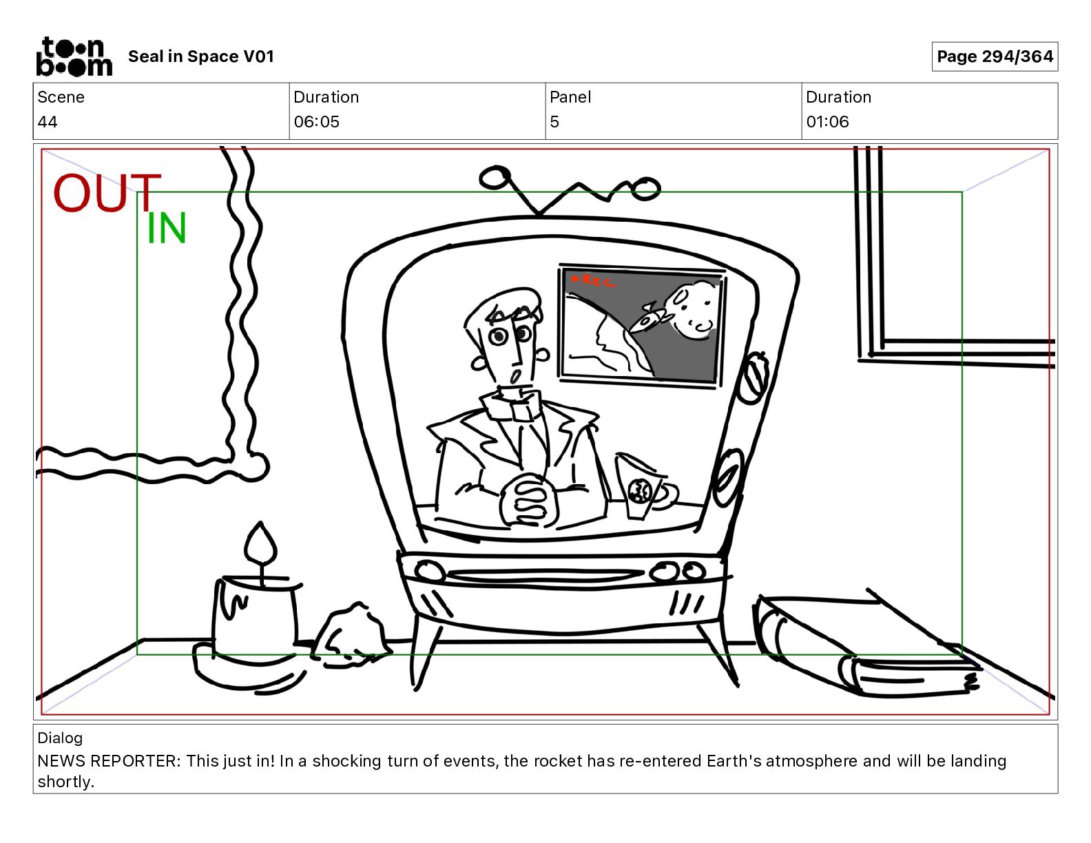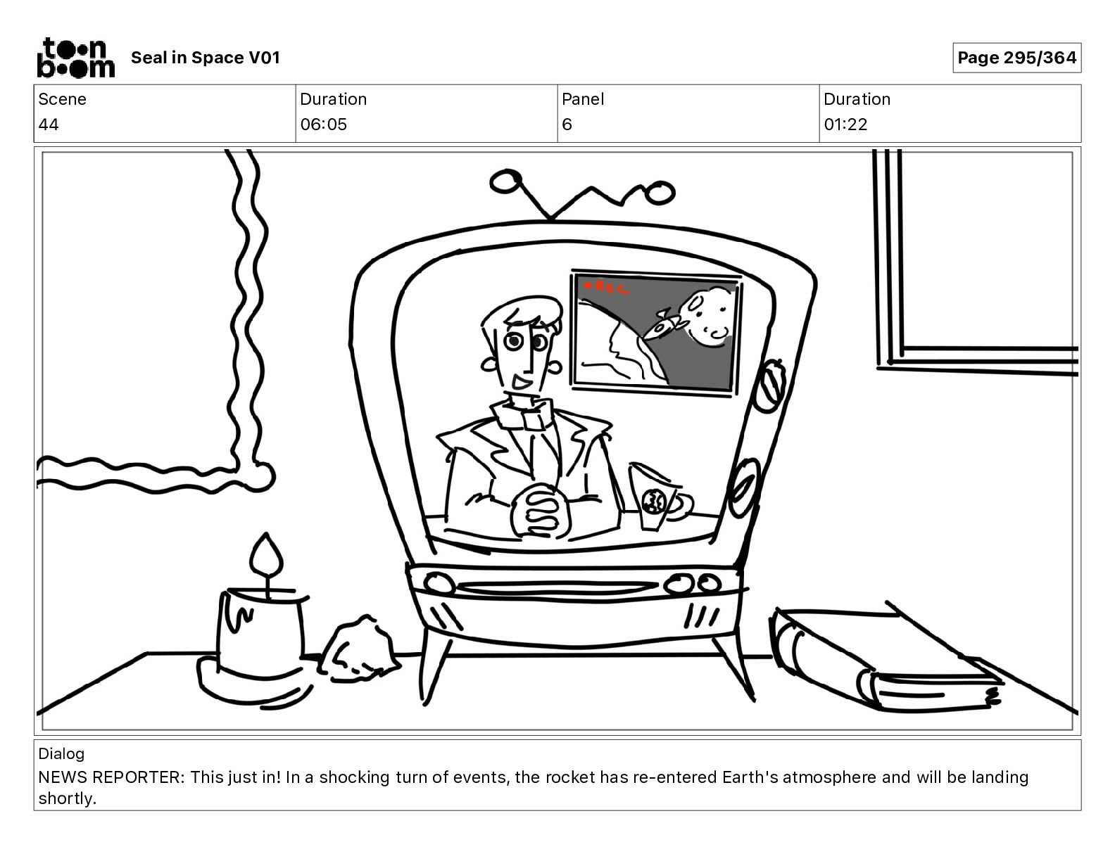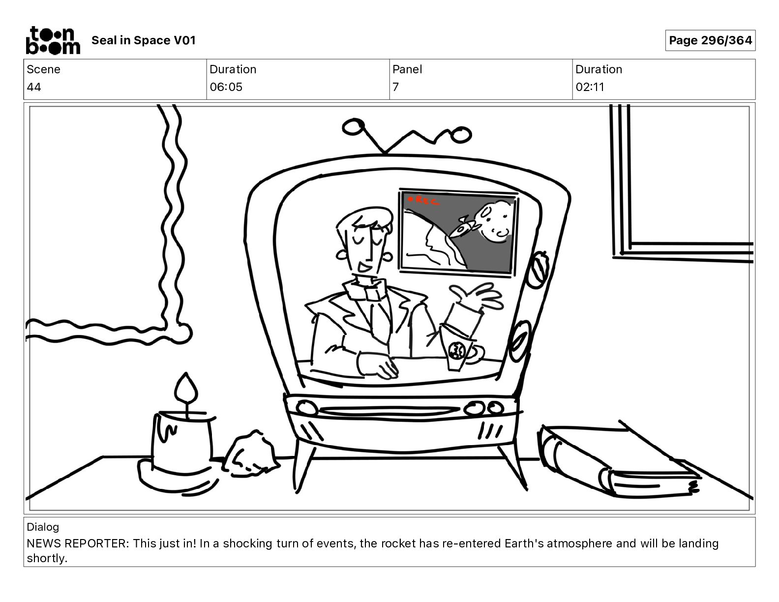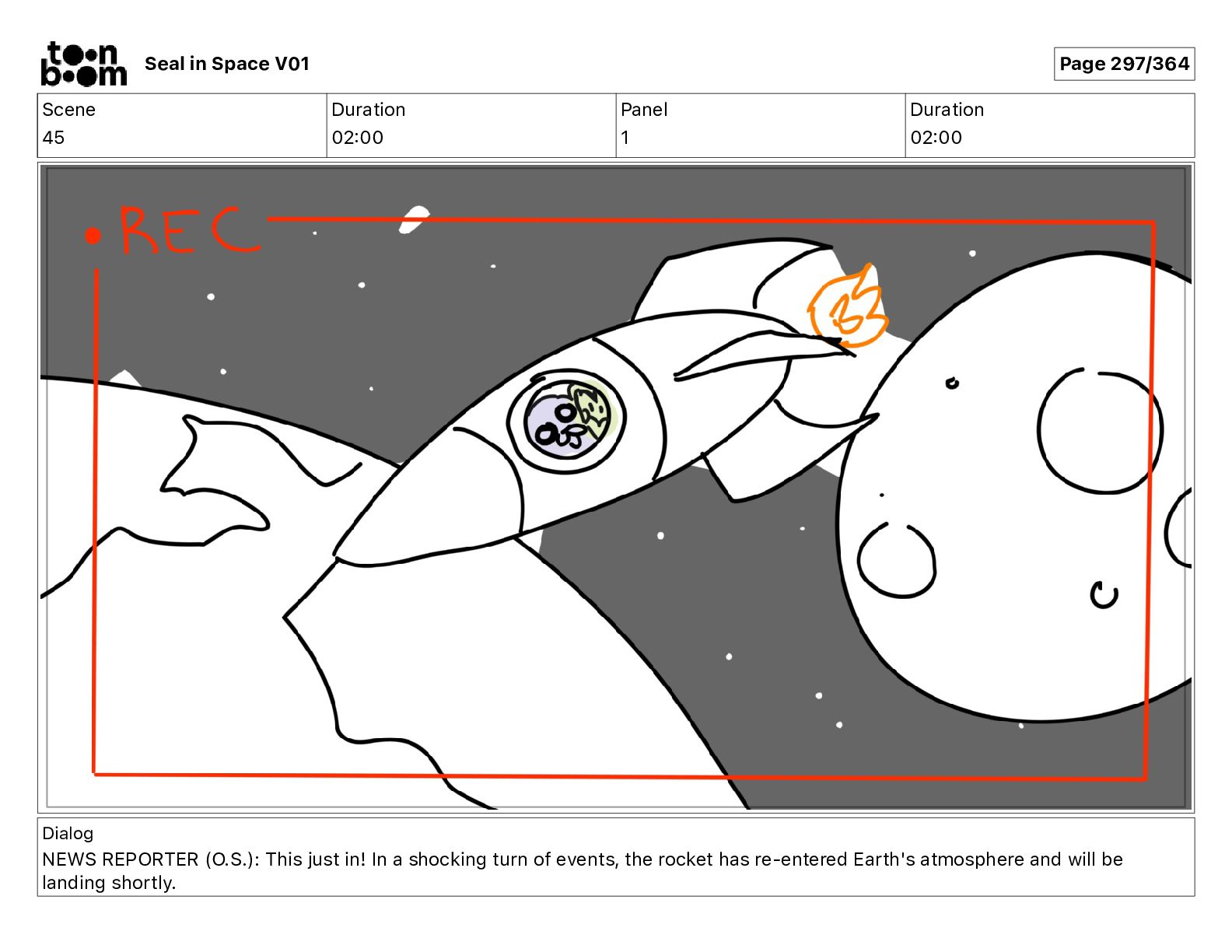 Dialog NEWS REPORTER (O.S.): This just in! In a shocking turn of events, the rocket has re-entered Earth's atmosphere and will be landing shortly. Seal in Space V01 Page 297/364