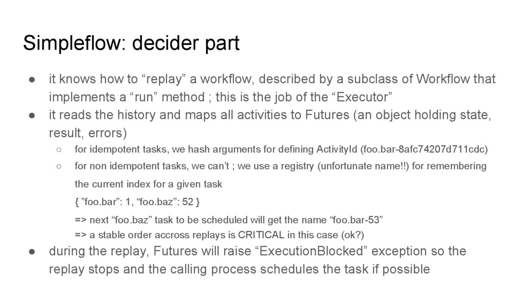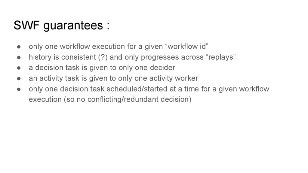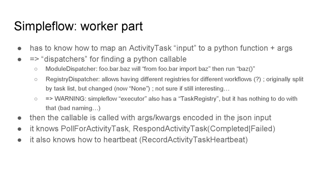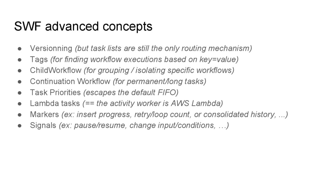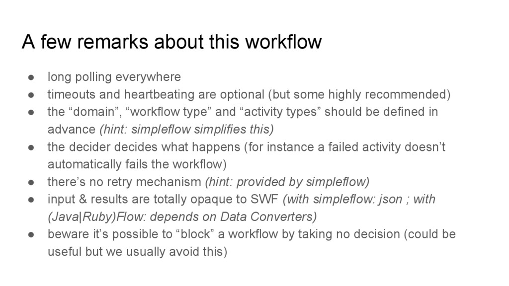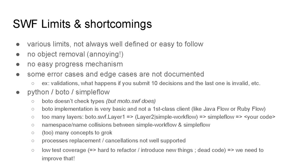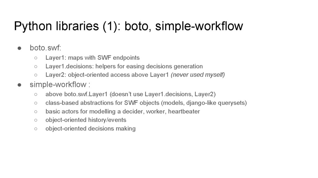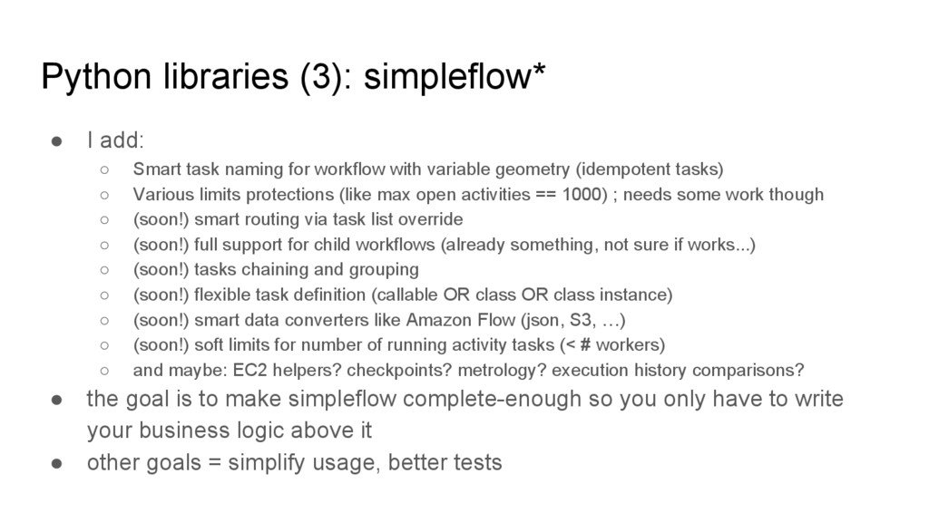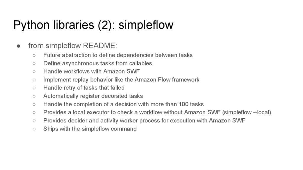 This presentation provides an overview of Amazon Simple Workflow (aka SWF) and some details about the python high-level library simpleflow developed by Botify. If you're interested in simpleflow or Amazon SWF, don't hesitate to drop a message to me or an issue in our Github tracker!