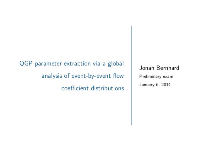 to entropy density, η/s. η ∼ tmf , s ∼ n =⇒ η/s ∼ ( /n)tmf 1 Water η/s ∼ 300 at STP, Helium η/s ∼ 2 at 3 K, QGP η/s ∼ O(10−1). small η/s large v2 large η/s small v2 Measuring QGP η/s: Observe experimental vn. Run model with variable η/s. Constrain η/s by matching vn. 10 / 29