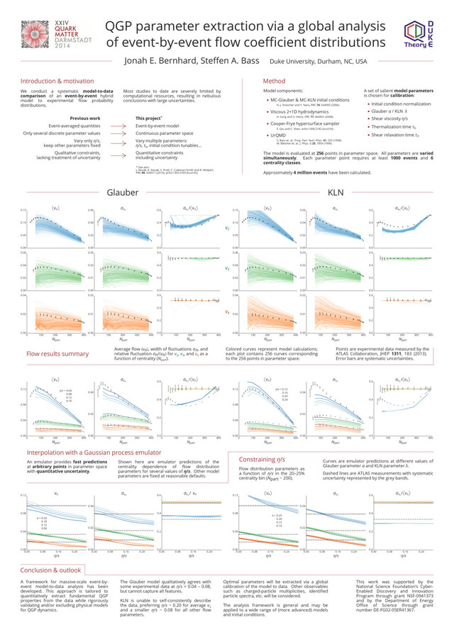 experimental data at η/s = 0.04 – 0.08, but cannot capture all features. KLN is unable to self-consistently describe the data, preferring η/s ~ 0.20 for average v2 and a smaller η/s ~ 0.08 for all other flow parameters. A framework for massive-scale event-by- event model-to-data analysis has been developed. This approach is tailored to quantitatively extract fundamental QGP properties from the data while rigorously validating and/or excluding physical models for QGP dynamics. Optimal parameters will be extracted via a global calibration of the model to data. Other observables such as charged-particle multiplicities, identified particle spectra, etc. will be considered. The analysis framework is general and may be applied to a wide range of (more advanced) models and initial conditions. This work was supported by the National Science Foundation’s Cyber- Enabled Discovery and Innovation Program through grant NSF-0941373 and by the Department of Energy Office of Science through grant number DE-FG02-05ER41367. 0.00 0.08 0.16 0.24 η/s 0.00 0.04 0.08 0.12 vn 0.00 0.08 0.16 0.24 η/s 0.00 0.02 0.04 σvn 0.00 0.08 0.16 0.24 η/s 0.0 0.2 0.4 0.6 σvn / vn Constraining η/s Flow distribution parameters as a function of η/s in the 20–25% centrality bin (Npart ~ 200). Curves are emulator predictions at different values of Glauber parameter α and KLN parameter λ. Dashed lines are ATLAS measurements with systematic uncertainty represented by the grey bands. λ = 0.25 0.20 0.15 0.10 0.00 0.08 0.16 0.24 η/s 0.00 0.04 0.08 0.12 vn 0.00 0.08 0.16 0.24 η/s 0.00 0.02 0.04 σvn 0.00 0.08 0.16 0.24 η/s 0.0 0.2 0.4 0.6 σvn / vn α = 0.24 0.18 0.12 0.06 0 100 200 300 400 Npart 0.00 0.04 0.08 0.12 vn 0 100 200 300 400 Npart 0.00 0.02 0.04 σvn 0 100 200 300 400 Npart 0.0 0.2 0.4 0.6 σvn / vn Interpolation with a Gaussian process emulator An emulator provides fast predictions at arbitrary points in parameter space with quantitative uncertainty. Shown here are emulator predictions of the centrality dependence of flow distribution parameters for several values of η/s. Other model parameters are fixed at reasonable defaults. η/s = 0.04 0.08 0.12 0.16 0 100 200 300 400 Npart 0.00 0.04 0.08 0.12 vn 0 100 200 300 400 Npart 0.00 0.02 0.04 σvn 0 100 200 300 400 Npart 0.0 0.2 0.4 0.6 σvn / vn η/s = 0.12 0.16 0.20 0.24 KLN Glauber v4 v2 v3 Flow results summary Points are experimental data measured by the ATLAS Collaboration, JHEP 1311, 183 (2013). Error bars are systematic uncertainties. Colored curves represent model calculations; each plot contains 256 curves corresponding to the 256 points in parameter space. Average flow vn , width of fluctuations σn, and relative fluctuation σn/ vn for v2 , v3 , and v4 as a function of centrality (Npart ). 0.00 0.05 0.10 0.15 vn 0.00 0.02 0.04 0.06 σvn 0.0 0.2 0.4 0.6 σvn / vn 0.00 0.02 0.04 0.06 0.00 0.01 0.02 0.03 0.0 0.2 0.4 0.6 0 100 200 300 400 Npart 0.00 0.02 0.04 0 100 200 300 400 Npart 0.00 0.01 0.02 0 100 200 300 400 Npart 0.0 0.2 0.4 0.6 0.00 0.05 0.10 0.15 vn 0.00 0.02 0.04 0.06 σvn 0.0 0.2 0.4 0.6 σvn / vn 0.00 0.02 0.04 0.06 0.00 0.01 0.02 0.03 0.0 0.2 0.4 0.6 0 100 200 300 400 Npart 0.00 0.02 0.04 0 100 200 300 400 Npart 0.00 0.01 0.02 0 100 200 300 400 Npart 0.0 0.2 0.4 0.6 We conduct a systematic model-to-data comparison of an event-by-event hybrid model to experimental flow probability distributions. Model components: MC-Glauber & MC-KLN initial conditions H.-J. Drescher and Y. Nara, PRC 74, 044905 (2006). Viscous 2+1D hydrodynamics H. Song and U. Heinz, PRC 77, 064901 (2008). Cooper-Frye hypersurface sampler Z. Qiu and C. Shen, arXiv:1308.2182 [nucl-th]. UrQMD S. Bass et. al., Prog. Part. Nucl. Phys. 41, 255 (1998); M. Bleicher et. al., J. Phys. G 25, 1859 (1999). A set of salient model parameters is chosen for calibration: Thermalization time τ0 Initial condition normalization Glauber α / KLN λ Shear viscosity η/s Shear relaxation time τΠ The model is evaluated at 256 points in parameter space. All parameters are varied simultaneously. Each parameter point requires at least 1000 events and 6 centrality classes. Approximately 4 million events have been calculated. Most studies to date are severely limited by computational resources, resulting in nebulous conclusions with large uncertainties. Method * See also: J. Novak, K. Novak, S. Pratt, C. Coleman-Smith and R. Wolpert, PRC 89, 034917 (2014), arXiv:1303.5769 [nucl-th]. This project* Event-by-event model Vary multiple parameters: η/s, τ0 , initial condition tunables... Continuous parameter space Quantitative constraints including uncertainty Previous work Vary only η/s, keep other parameters fixed Qualitative constraints, lacking treatment of uncertainty Only several discrete parameter values Event-averaged quantities Introduction & motivation Duke University, Durham, NC, USA Jonah E. Bernhard, Steffen A. Bass QGP parameter extraction via a global analysis of event-by-event flow coefficient distributions