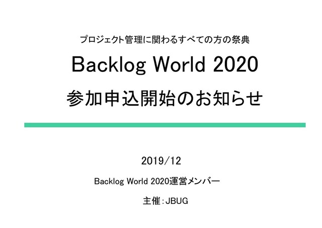 Backlog World 2020 は2020/2/29に開催されます。参加申込みが開始されましたのでお知らせします。詳細はこちら https://jbug.info/backlogworld2020/entry_site_open/