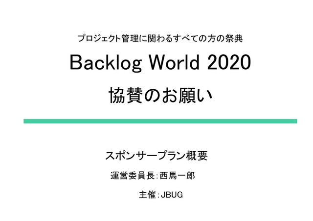 2020年2月29日[土]に東京都品川区北品川の大崎ブライトコアホールで開催するBacklog World 2020の協賛のお願いのスライドです。