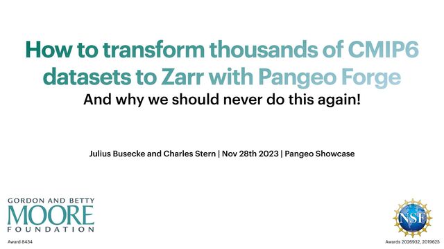 Slides for "How to transform thousands of CMIP6 datasets to Zarr with Pangeo Forge - And why we should never do this again!" presented at Pangeo Showcase on November 29, 2023 by Julius Busecke, Charles Stern.