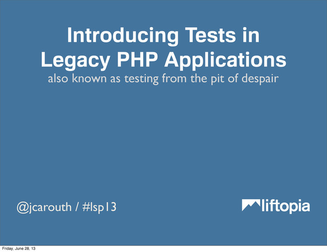 You know testing is beneficial to your project. You are familiar with merits and caveats of test-driven development. But the project you’re hacking on right now is what most would call a legacy application. How do you apply your test knowledge to an application that doesn’t lend itself to traditional unit testing? The answer most will give is, “you don’t,” but we’re going to look at ways to write tests now that will allow you to improve and refactor your application to evolve the code to a more manageable state. The traditional “easy” route to dealing with legacy code is to rewrite but a little patience and skill applied to writing tests will yeild better results.