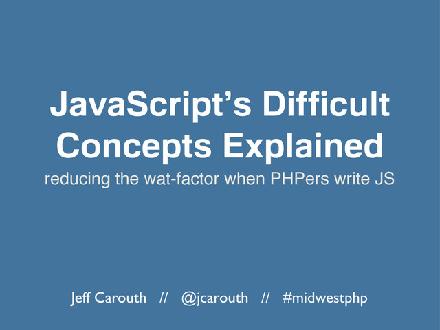 When approaching JavaScript as a PHP developer some of the nuances of the language take a while to become comfortable. If you've ever wondered how context and the this keyword work, when to declare a variable, how to create objects and use prototypes in JavaScript, you are not alone. These concepts seems crazy at first, but with some examples you can grasp and use them in your code today. This session will cover the finer points of JavaScript the language from the perspective of someone who is proficient with PHP or another language. - See more at: http://midwestphp.org/sessions/JavaScript's_Difficult_Concepts_Explained#sthash.nKUpmxaT.dpuf