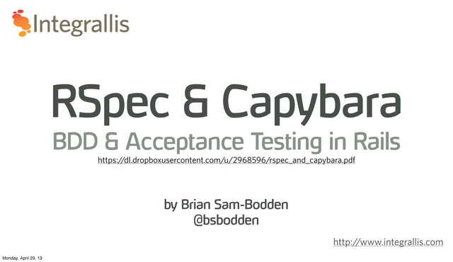 collection of matchers, including: be_true # passes if actual is truthy (not nil or false) be_false # passes if actual is falsy (nil or false) be_nil # passes if actual is nil be # passes if actual is truthy (not nil or false) expect { ... }.to raise_error expect { ... }.to raise_error(ErrorClass) expect { ... }.to raise_error("message") expect { ... }.to raise_error(ErrorClass, "message") expect { ... }.to throw_symbol expect { ... }.to throw_symbol(:symbol) expect { ... }.to throw_symbol(:symbol, 'value') be_xxx # passes if actual.xxx? have_xxx(:arg) # passes if actual.has_xxx?(:arg) Monday, April 29, 13