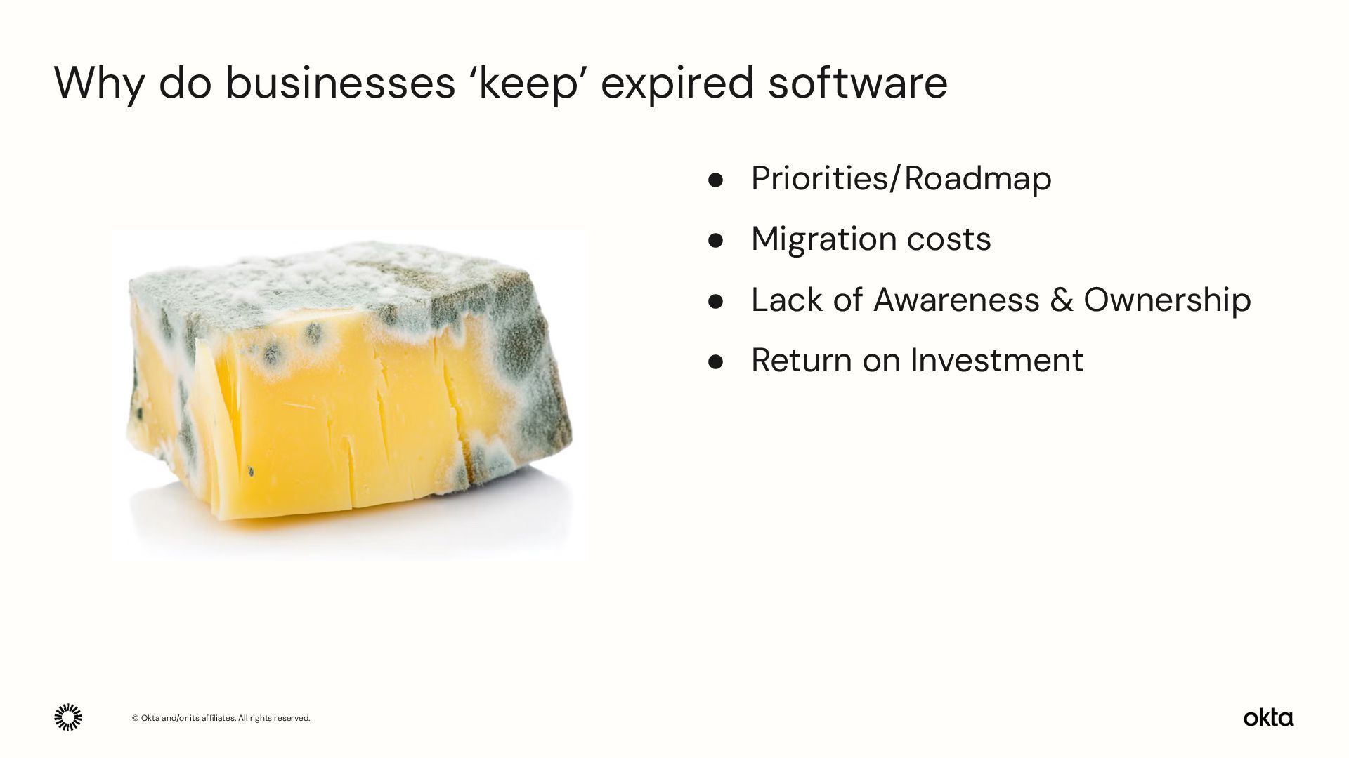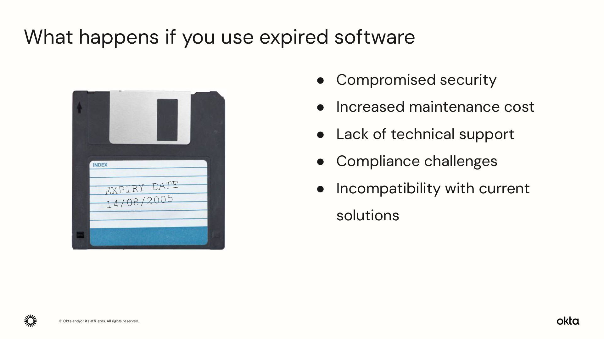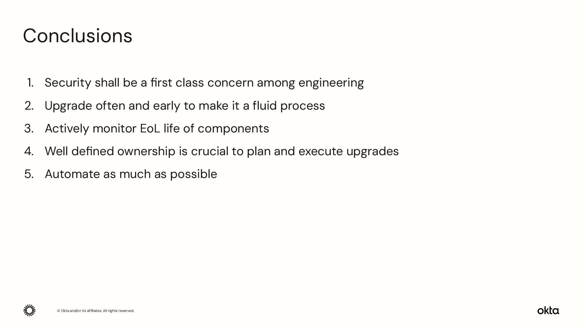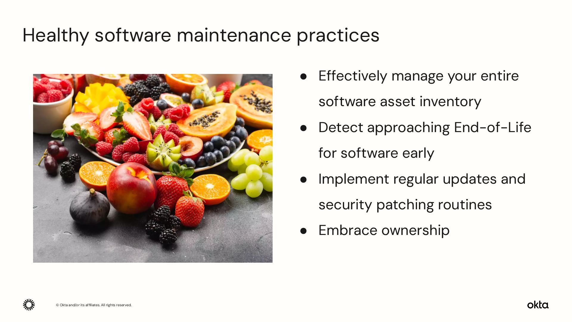 - Best practices for a healthy eating (Regular upgrades, patching, and a strong tech lifecycle strategy), specially those which work at Okta.