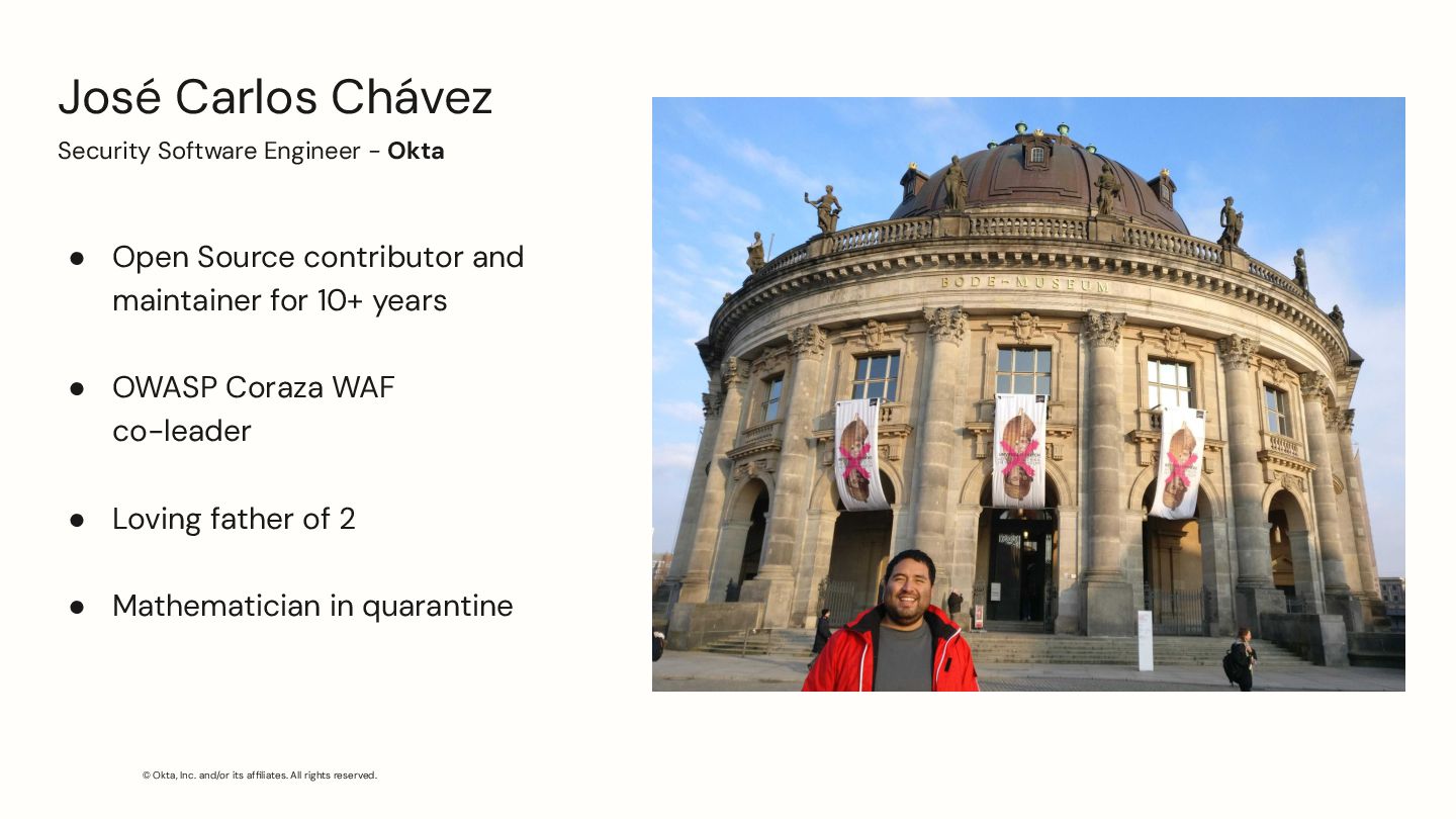 Carlos Chávez Security Software Engineer - Okta • Open Source contributor and maintainer for 10+ years • OWASP Coraza WAF co-leader • Loving father of 2 • Mathematician in quarantine