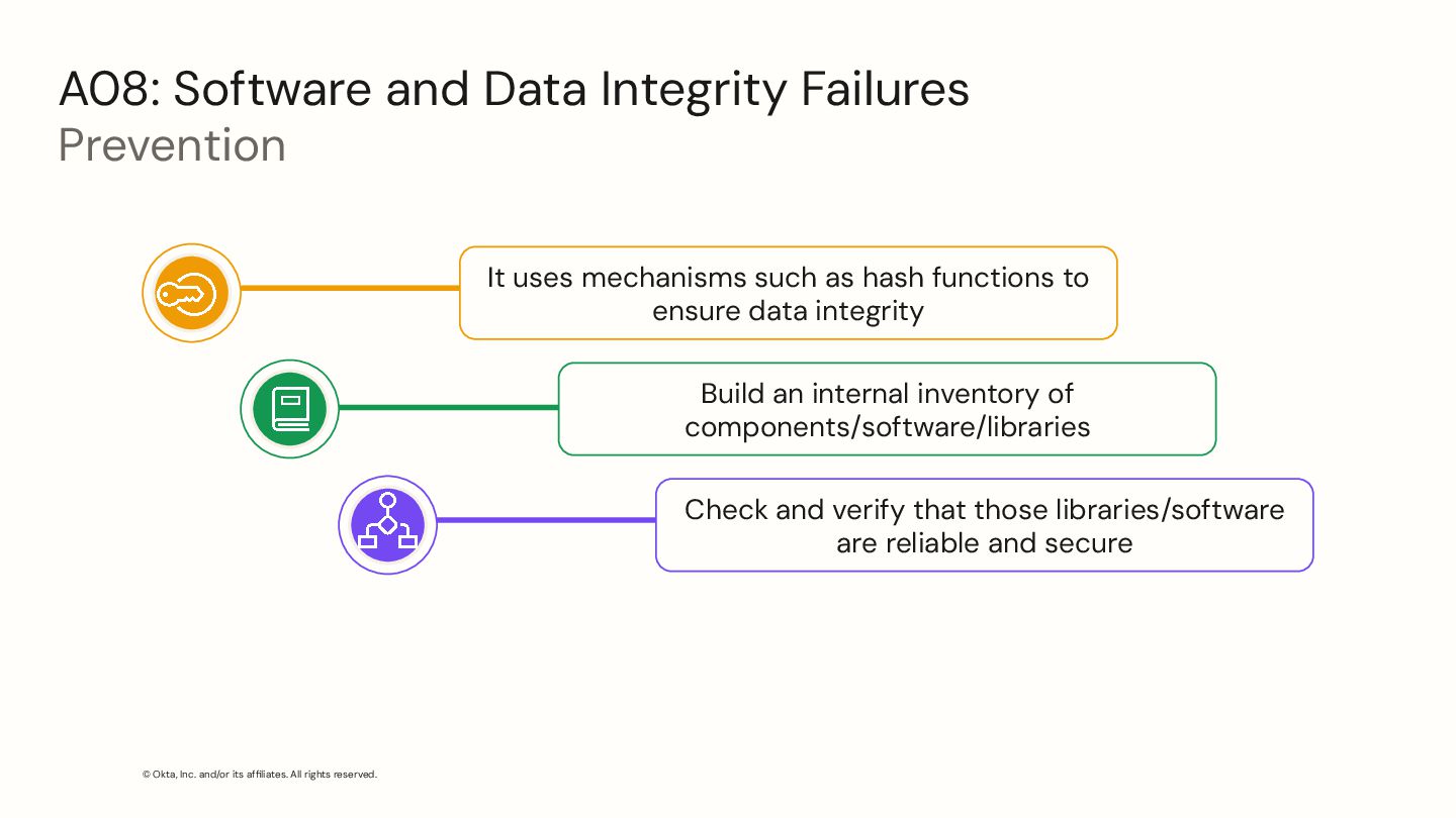 Software and Data Integrity Failures Prevention It uses mechanisms such as hash functions to ensure data integrity Build an internal inventory of components/software/libraries Check and verify that those libraries/software are reliable and secure