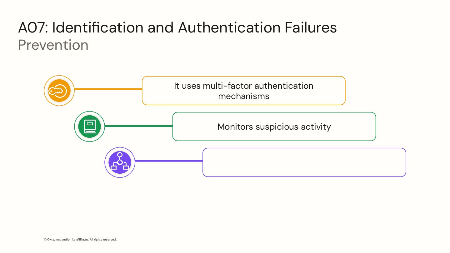 Identification and Authentication Failures Prevention It uses multi-factor authentication mechanisms Monitors suspicious activity