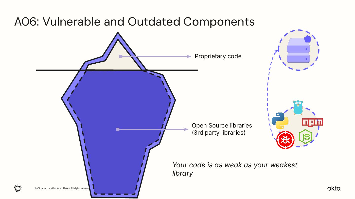 code Open Source libraries 3rd party libraries) Your code is as weak as your weakest library A06: Vulnerable and Outdated Components