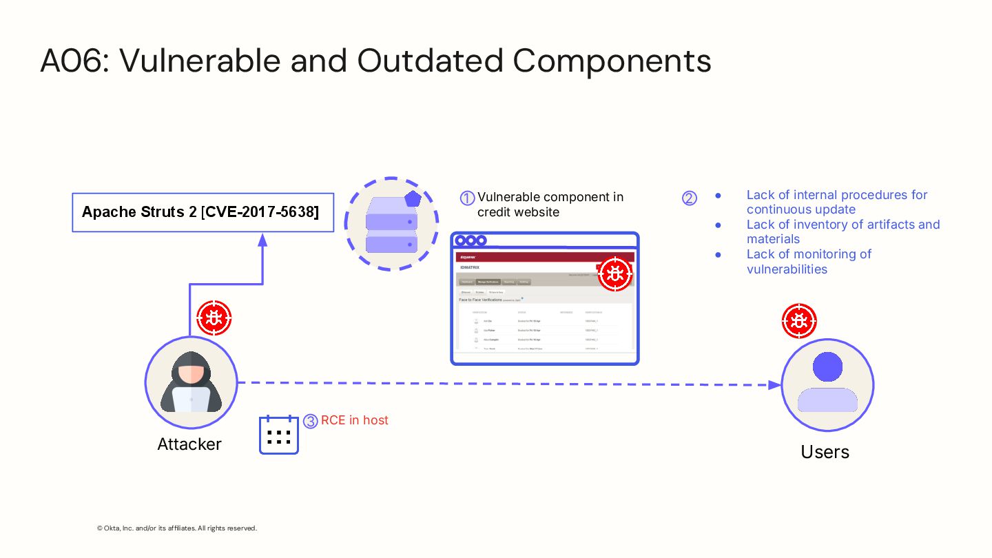 Vulnerable and Outdated Components Attacker 1 2 Vulnerable component in credit website • Lack of internal procedures for continuous update • Lack of inventory of artifacts and materials • Lack of monitoring of vulnerabilities Users RCE in host Apache Struts 2 [CVE-2017-5638] 3