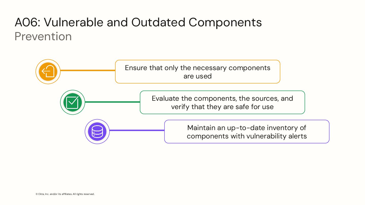 Vulnerable and Outdated Components Prevention Ensure that only the necessary components are used Evaluate the components, the sources, and verify that they are safe for use Maintain an up-to-date inventory of components with vulnerability alerts