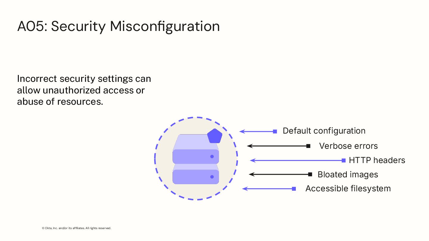 headers Accessible filesystem Default configuration Bloated images Verbose errors A05: Security Misconfiguration Incorrect security settings can allow unauthorized access or abuse of resources.