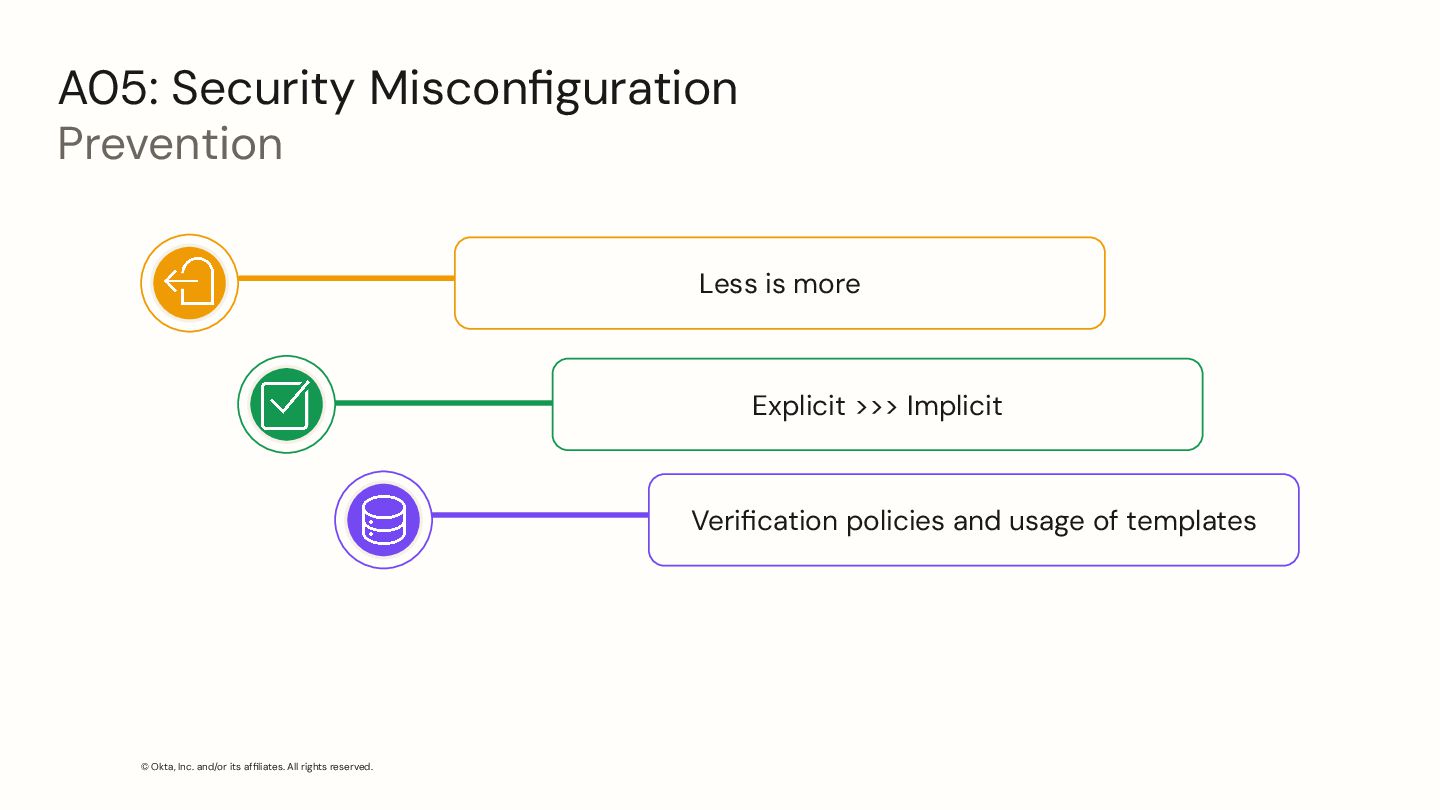 Security Misconfiguration Prevention Less is more Explicit >>> Implicit Verification policies and usage of templates