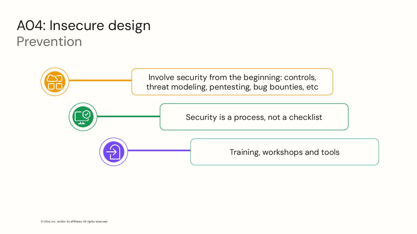 Insecure design Prevention Involve security from the beginning: controls, threat modeling, pentesting, bug bounties, etc Security is a process, not a checklist Training, workshops and tools