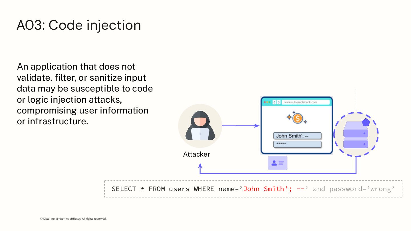 application that does not validate, filter, or sanitize input data may be susceptible to code or logic injection attacks, compromising user information or infrastructure. Attacker SELECT * FROM users WHERE name=’John Smith’; --’ and password=’wrong’ A03: Code injection