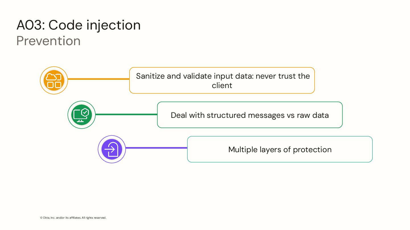Code injection Prevention Sanitize and validate input data: never trust the client Deal with structured messages vs raw data Multiple layers of protection