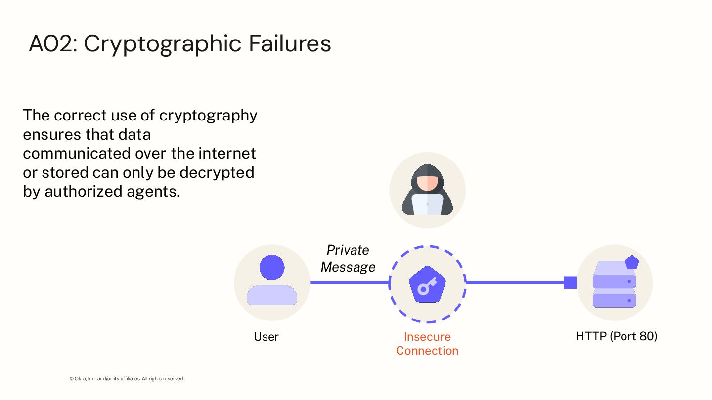 correct use of cryptography ensures that data communicated over the internet or stored can only be decrypted by authorized agents. HTTP (Port 80) User Insecure Connection Private Message A02: Cryptographic Failures