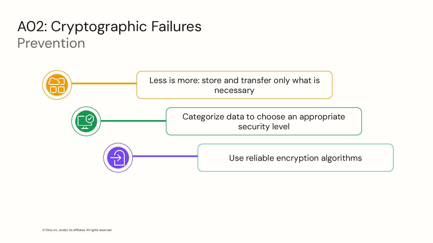 Cryptographic Failures Prevention Less is more: store and transfer only what is necessary Categorize data to choose an appropriate security level Use reliable encryption algorithms