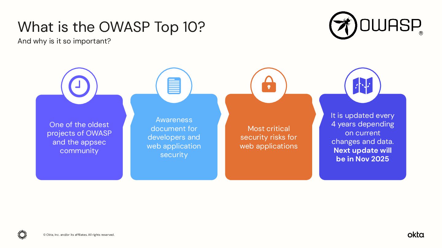 is the OWASP Top 10? One of the oldest projects of OWASP and the appsec community It is updated every 4 years depending on current changes and data. Next update will be in Nov 2025 Awareness document for developers and web application security Most critical security risks for web applications And why is it so important?