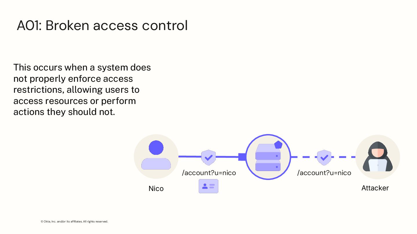 occurs when a system does not properly enforce access restrictions, allowing users to access resources or perform actions they should not. Attacker Nico /account?u=nico A01: Broken access control /account?u=nico